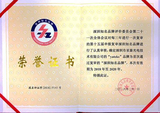 工業內窺鏡和油液監測產品的研發和制造商,公司于2015年1月通過評審,獲得“深圳知名品牌”稱號!此次復審順利通過,既是亞泰光電堅持品質如一、不斷進取的結果,同時也說明了亞泰光電產品在業界內的知名度、美譽度和影響力!
