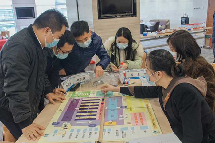 參訓學員分成6個小組,模擬企業實際運作背景,每組代表一家虛擬企業,各小組成員按角色分工,分別擔任企業中的總裁、市場營銷總監、生產總監、財務總監、研發總監等職位,一家家企業相繼成立。