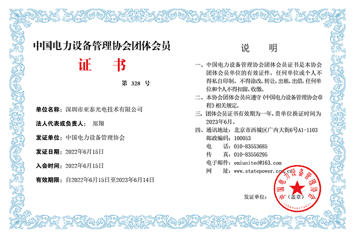 6月15日,深圳市亞泰光電技術(shù)有限公司正式接到中國電力設(shè)備管理協(xié)會頒發(fā)的“中國電力設(shè)備管理協(xié)會單位會員證書”,經(jīng)過前期申請、材料評審等一系列工作,亞泰光電正式成為中國電力設(shè)備管理協(xié)會的一員。