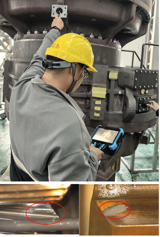 案例2?:針對某5MW風機葉片異響問題,技術人員使用亞泰AIE615兩百萬像素內窺鏡快速定位齒輪腐蝕磨損,將原本需吊裝拆卸的3天檢測流程縮短至2小時,?減少發電損失約20萬元/天?;